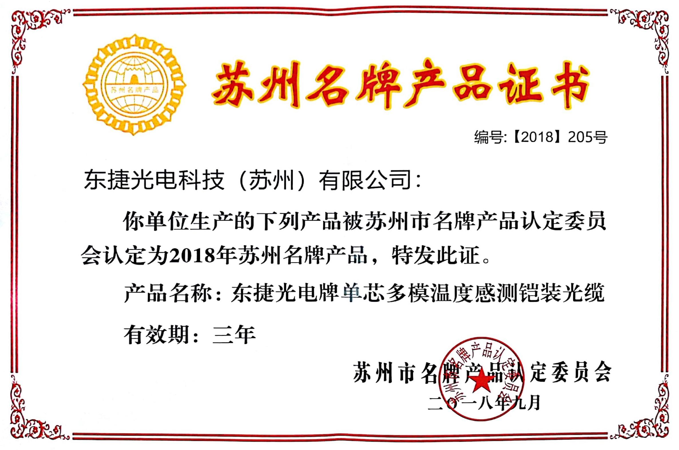 2018年9月,東捷光電科技(蘇州)有限公司生產的“單芯多模溫度感測鎧裝光纜”的生產質量經蘇州...