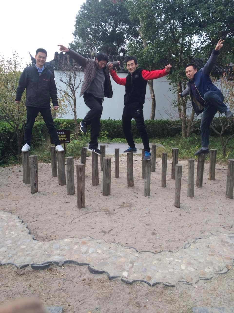 看到另一側的梅花樁,我就樂了,男人的天性愛玩,都想上去一試身手,看,大鵬展翅,要保持平衡真是不易,而且還不低,有一米多高呢,木樁之間的間隔還不近, 臺上一分中,臺下十年功呢。